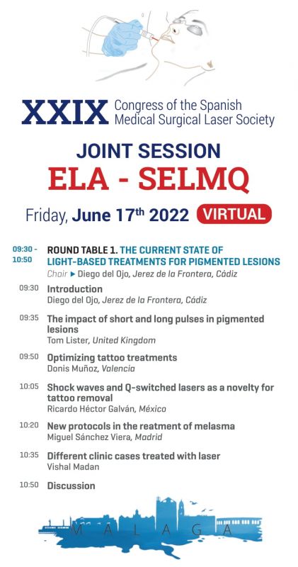 The Congress of the SELMQ (Spanish Society of Surgical Medical Laser) celebrated its XXIX Anniversary on the 16th to the 18th of June 2022. After the success in 2021 at the Malaga headquarters, just at the moment when the pandemic gave us a little respite, we decided to repeat in the same place knowing that Malaga attracts its visitors in addition to the culture and gastronomy for the friendliness and cordiality of its inhabitants. This year and under the auspices of the ELA (European Laser Association) and with the participation of the British Medical Laser Association (BMLA) we had the opportunity to share topics of interest to all with professionals from sister societies. For this we had simultaneous translation from English to Spanish on the first day of the Congress where the English-speaking speakers have been grouped.